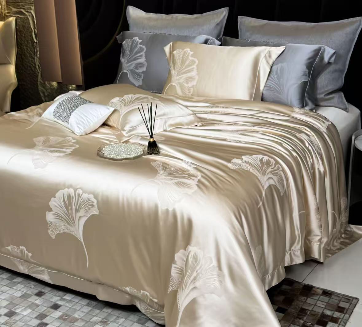 銀杏モチーフを配したベッドリネンで、ホテルライクな寝室演出に向くシリーズです。季節感と高級感の両方を備え、トップページや販促用の主役として使いやすい商品です。