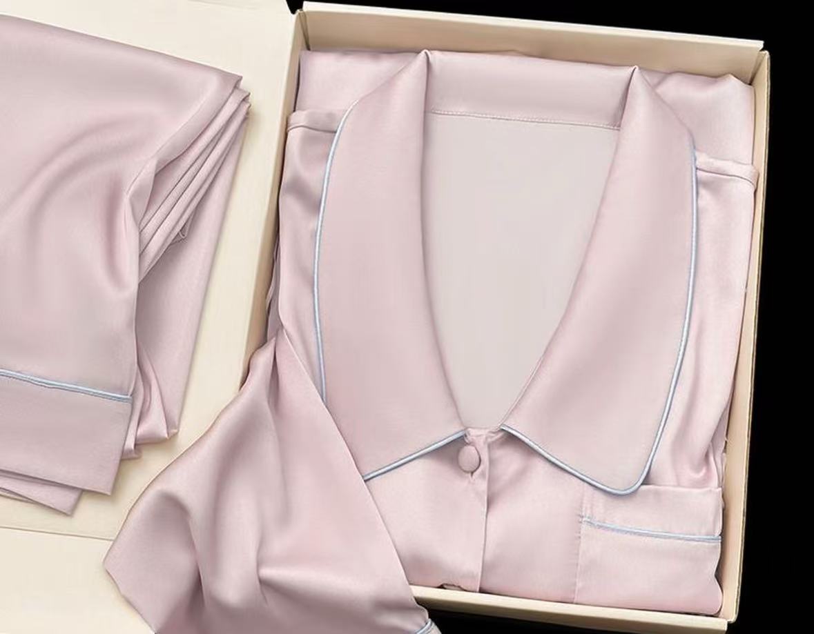 丸みのある襟元と淡いピンクの艶で、最も見せやすいベーシックなシルクパジャマセットです。箱入りの状態でも映え、ギフト需要や女性向け提案と相性のよい商品です。
