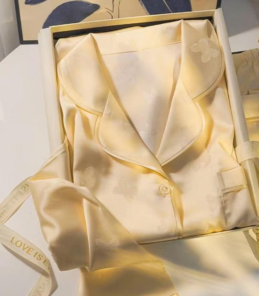 淡いイエローの生地にジャカード柄を重ね、袖口のレースで華やかさを加えたシルクルームウェアです。写真映えと装飾性を両立したシリーズとして提案できます。