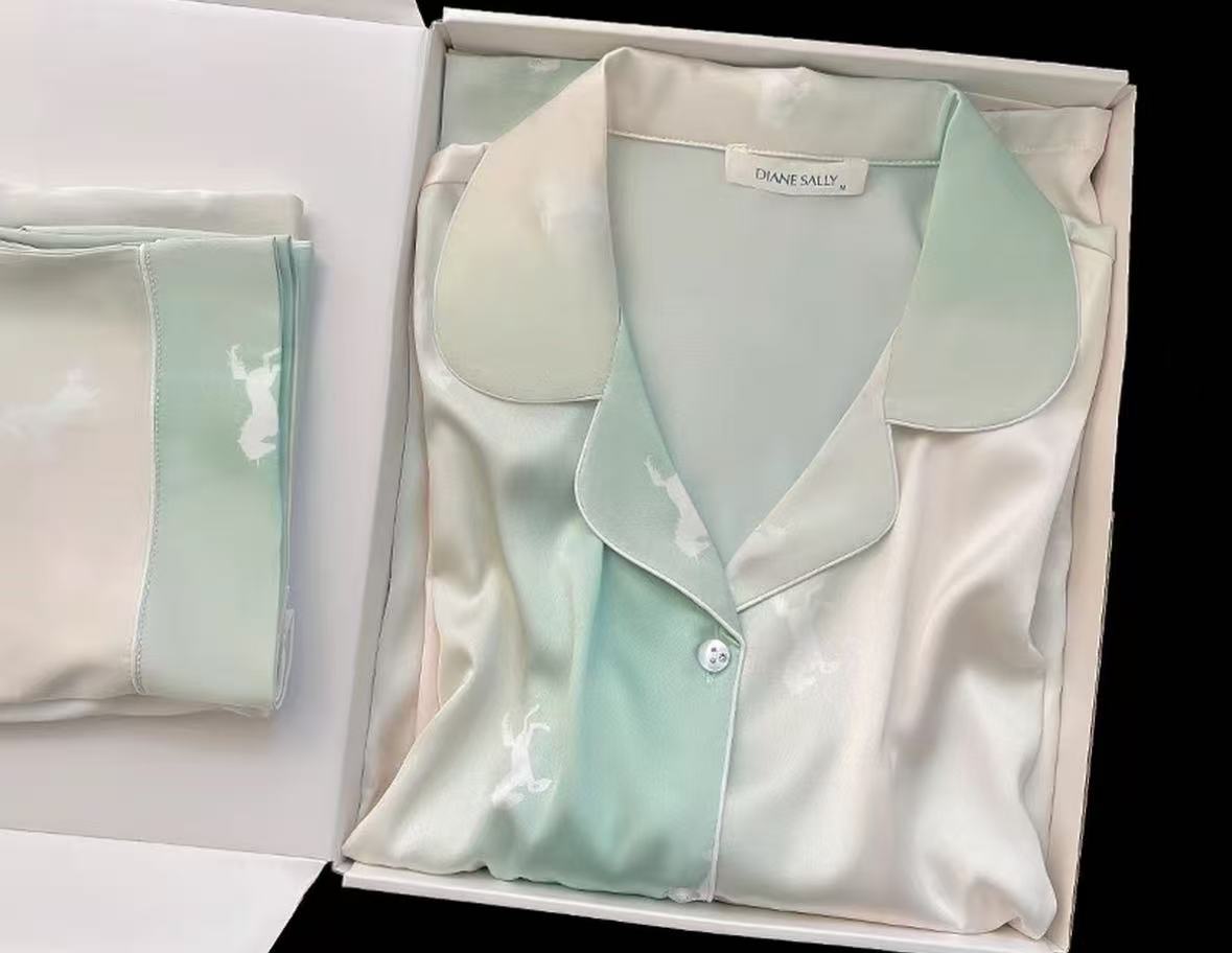 淡いミントカラーを軸にした箱入りシルクパジャマセットです。季節感のある見え方が作りやすく、春夏の新規提案や色違い展開にも向いています。