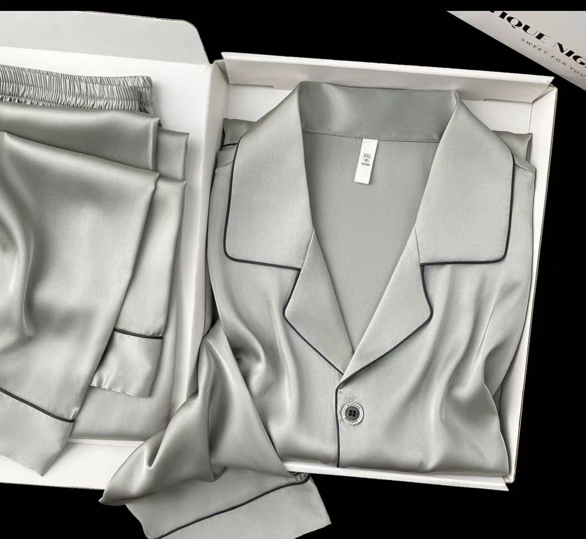 シルバーグレーの無地ベースで、男女問わず提案しやすいシルクパジャマセットです。装飾を抑えた分、素材感と艶を前面に出せるため、定番ラインとして扱いやすい構成です。