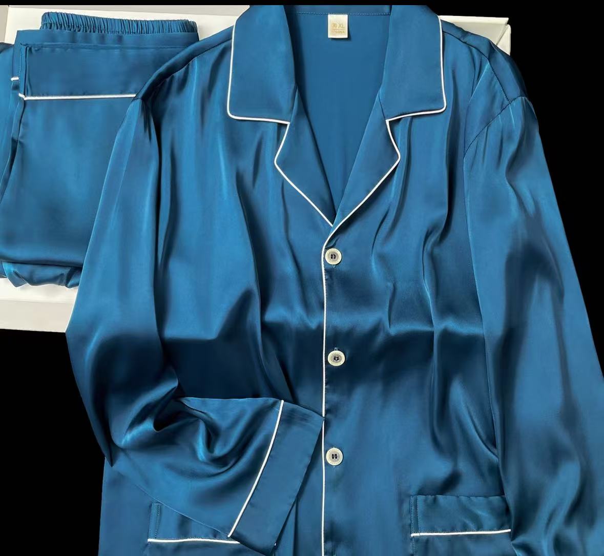 深いブルーにホワイトのパイピングを合わせた、視認性の高いシルクパジャマセットです。画像映えが強く、商品一覧の中でもアクセントとして使いやすいシリーズです。