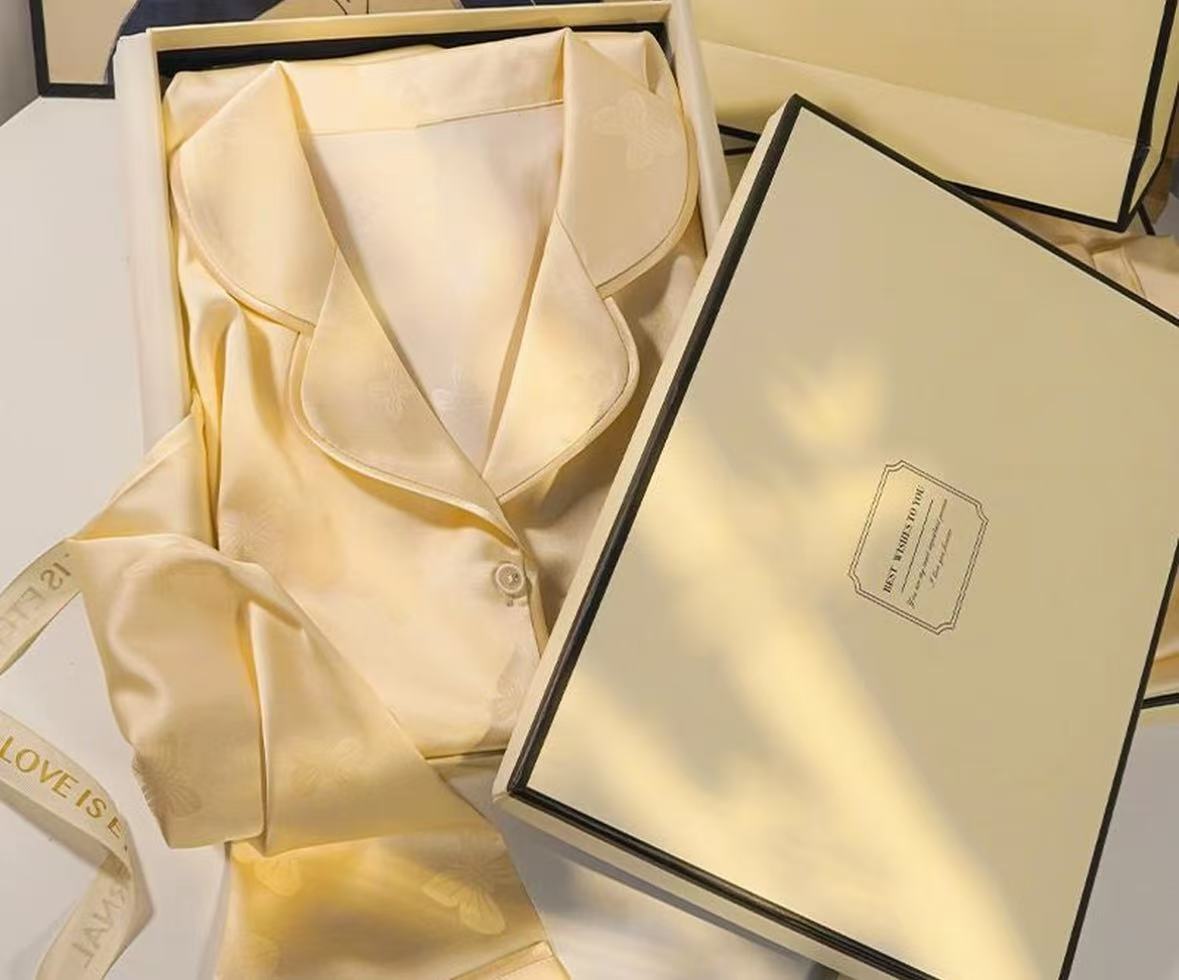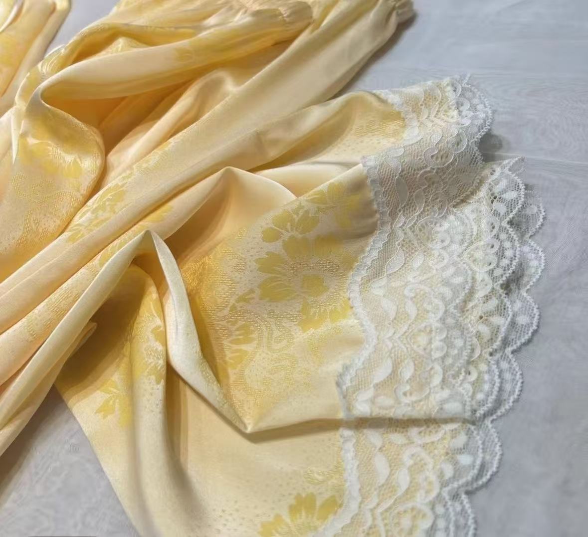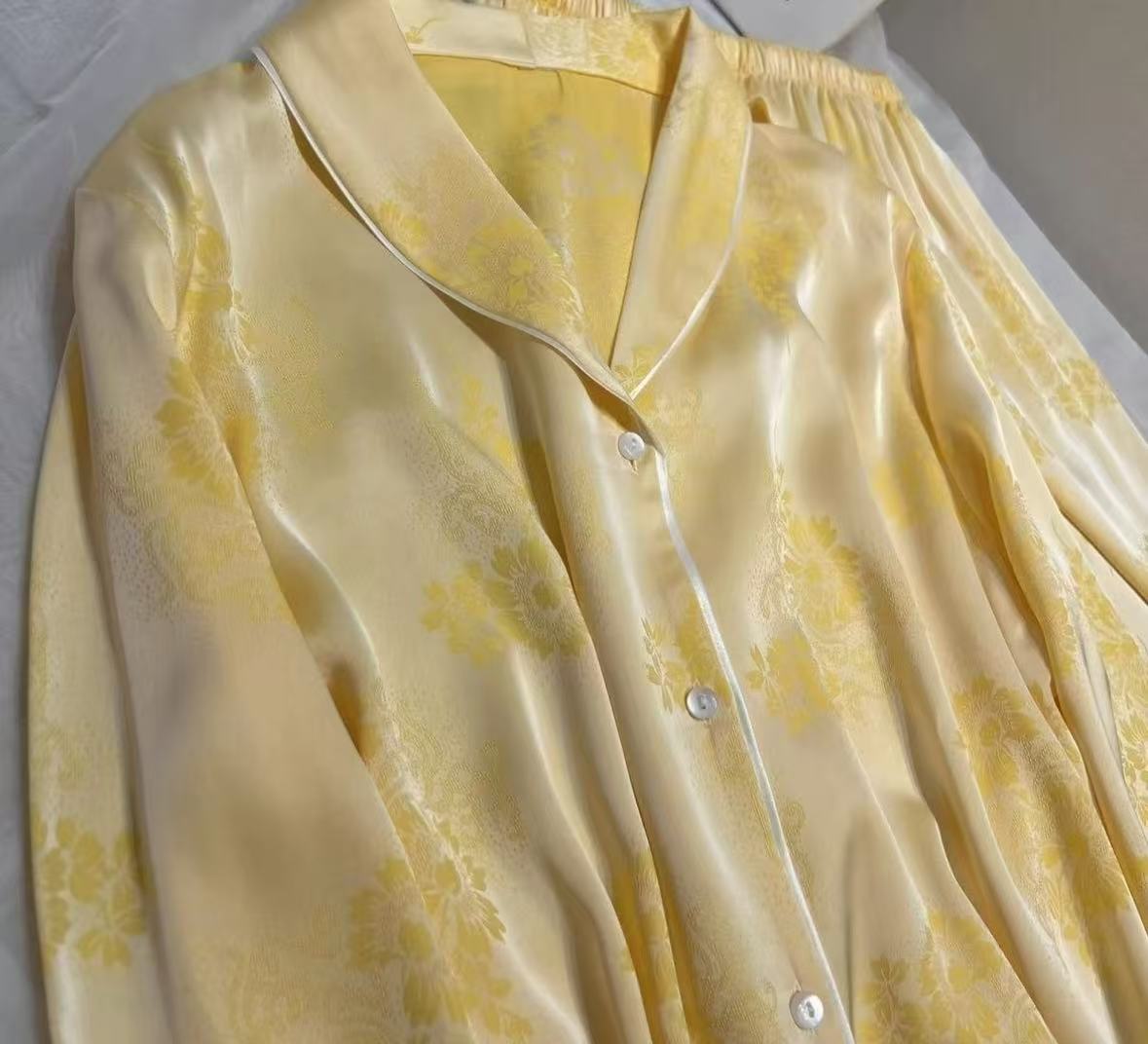 淡いイエローの生地にジャカード柄を重ね、袖口のレースで華やかさを加えたシルクルームウェアです。写真映えと装飾性を両立したシリーズとして提案できます。