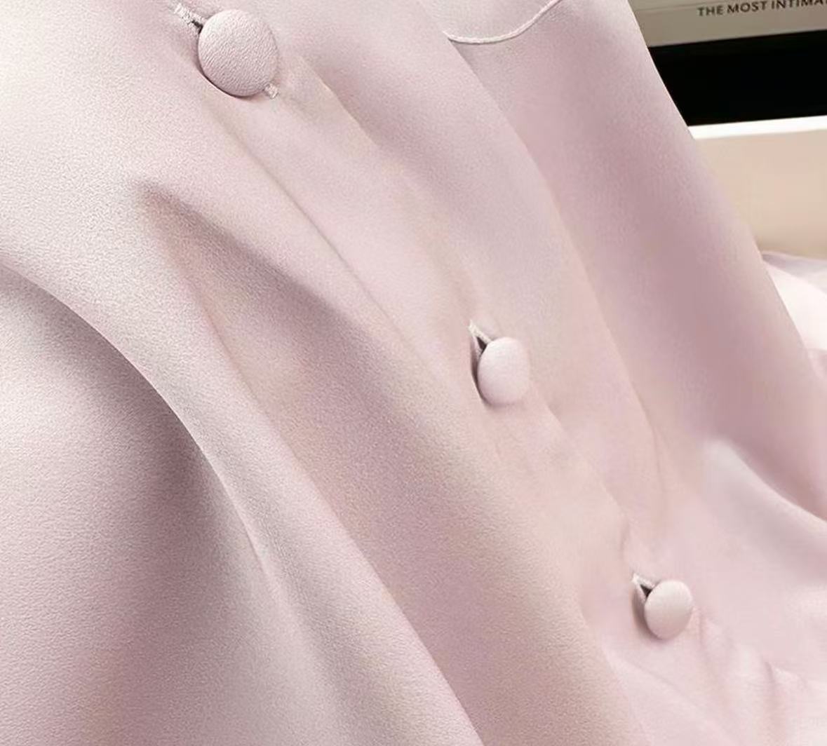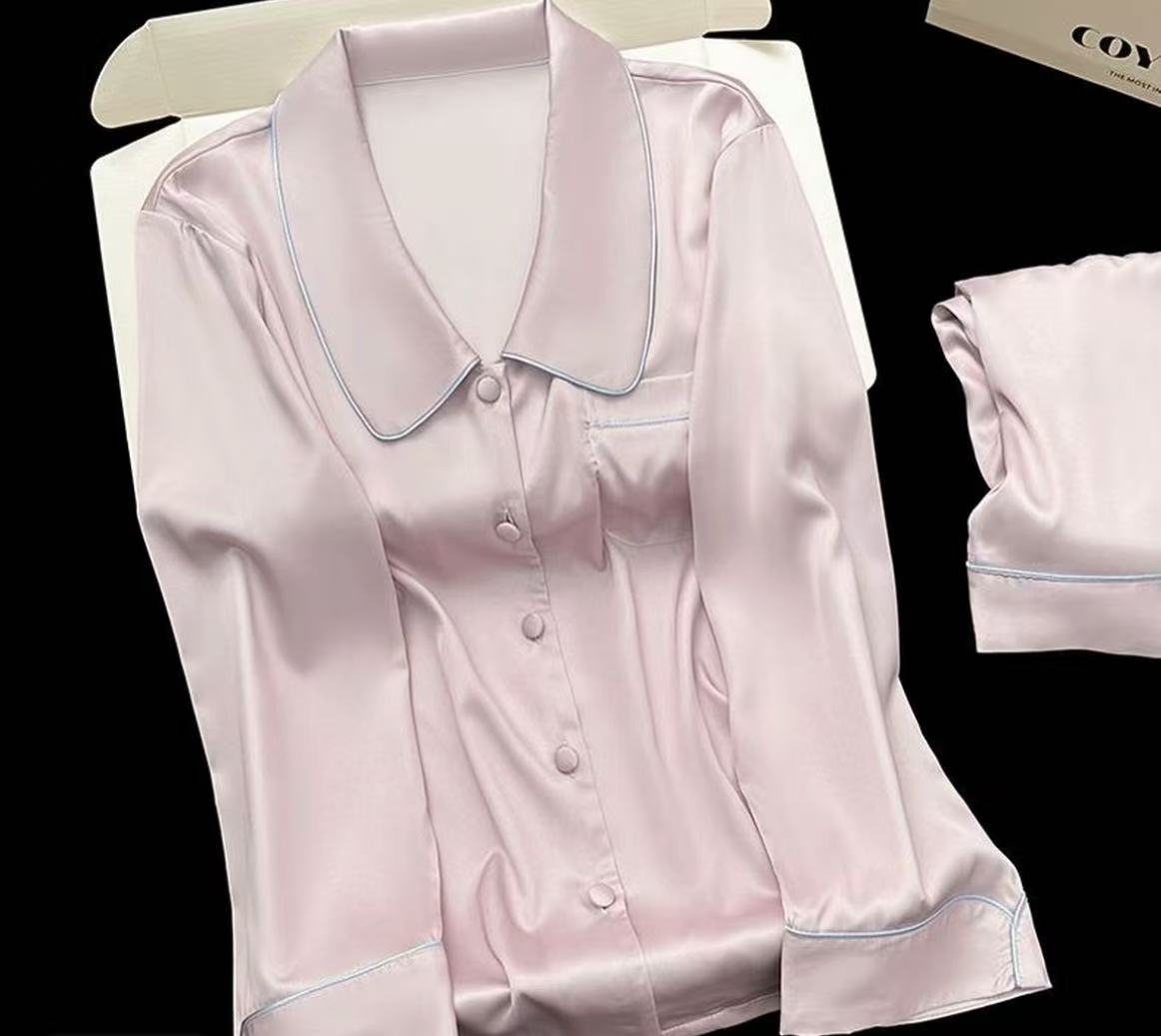 丸みのある襟元と淡いピンクの艶で、最も見せやすいベーシックなシルクパジャマセットです。箱入りの状態でも映え、ギフト需要や女性向け提案と相性のよい商品です。