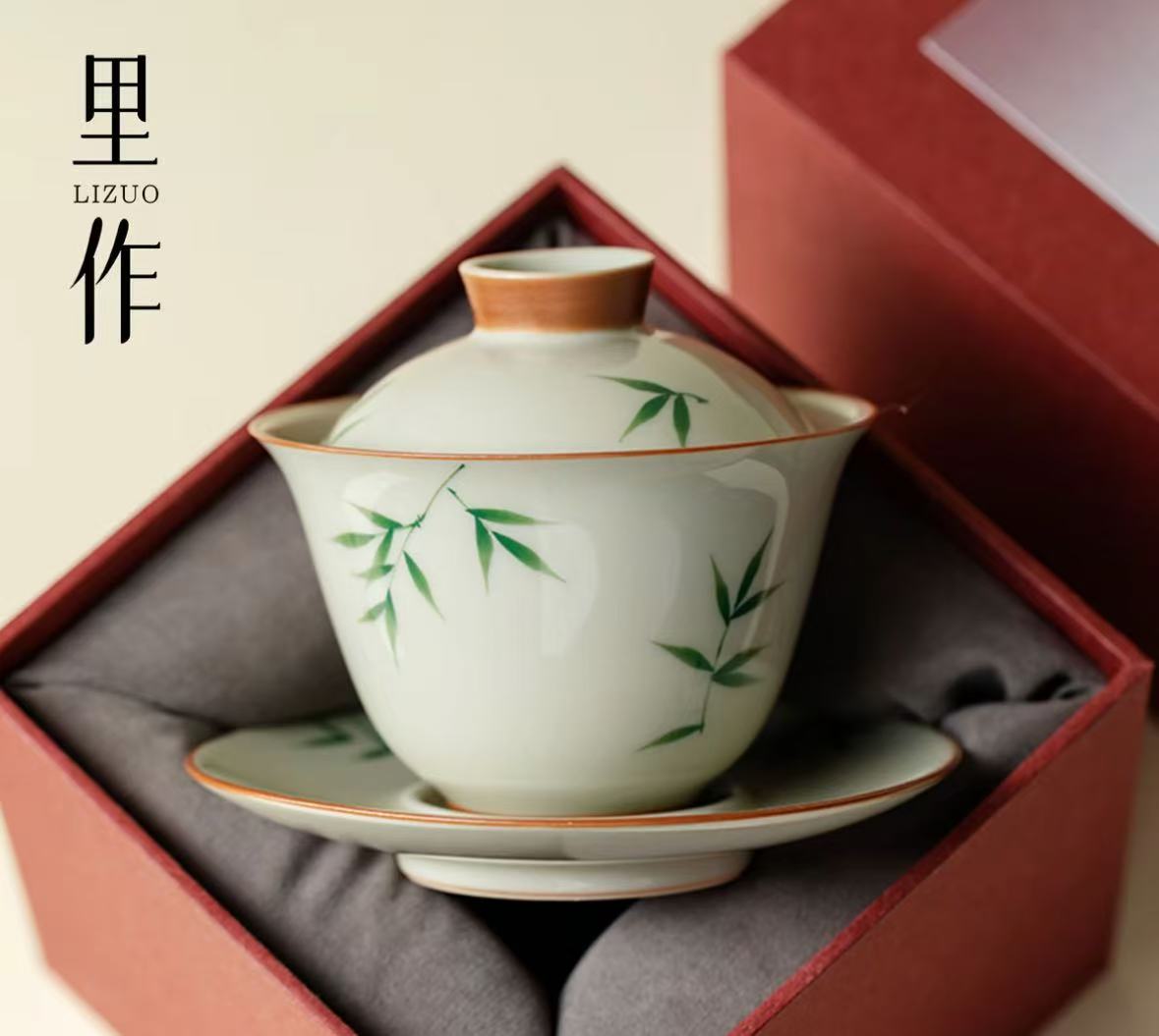 紫系の蓋付き碗、竹絵の蓋碗、春色のセット展示など、ギフト性と見栄えを重視した茶器群です。単品よりもセット提案に強く、展示会や商談でも印象を作りやすい商品です。