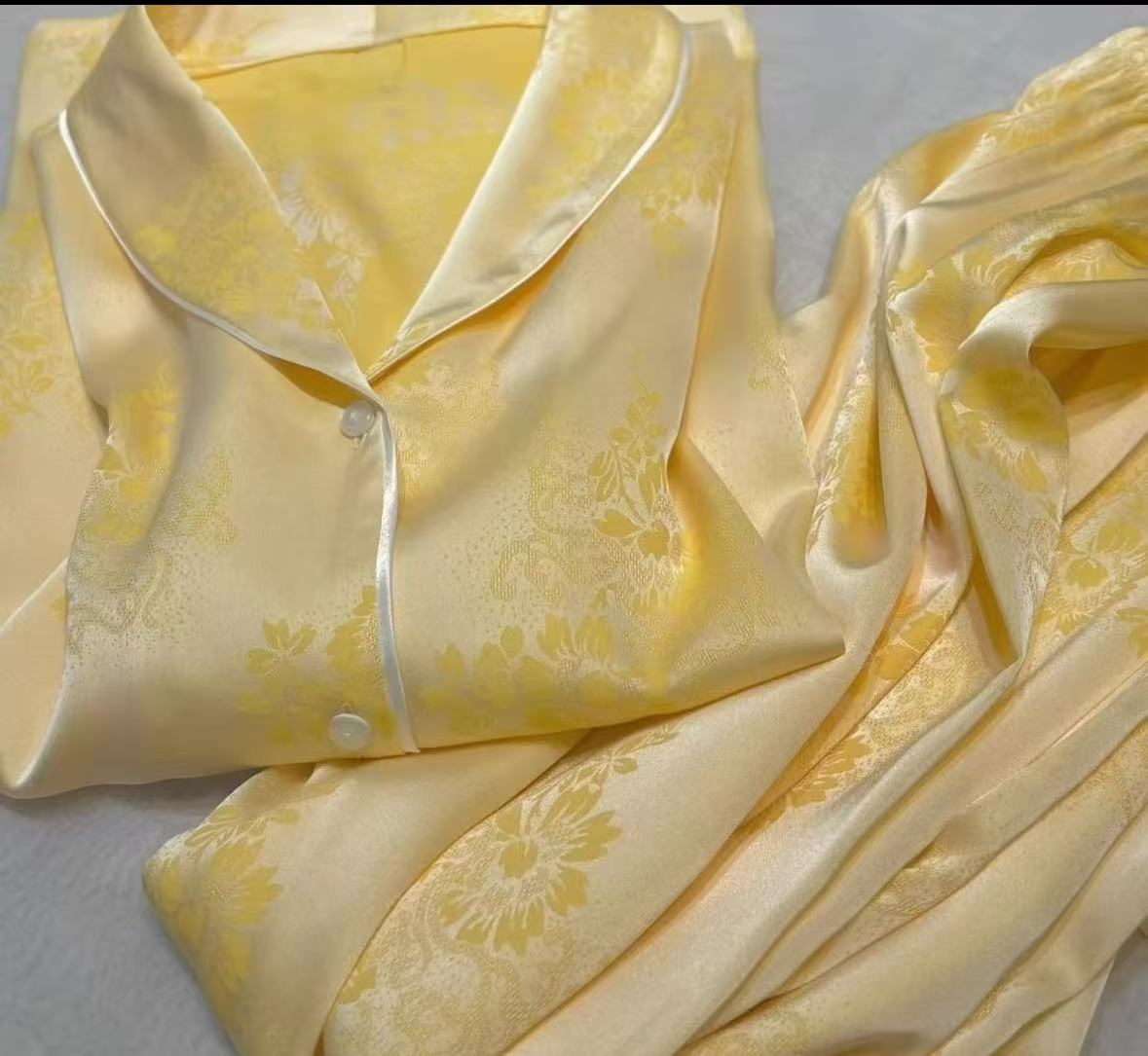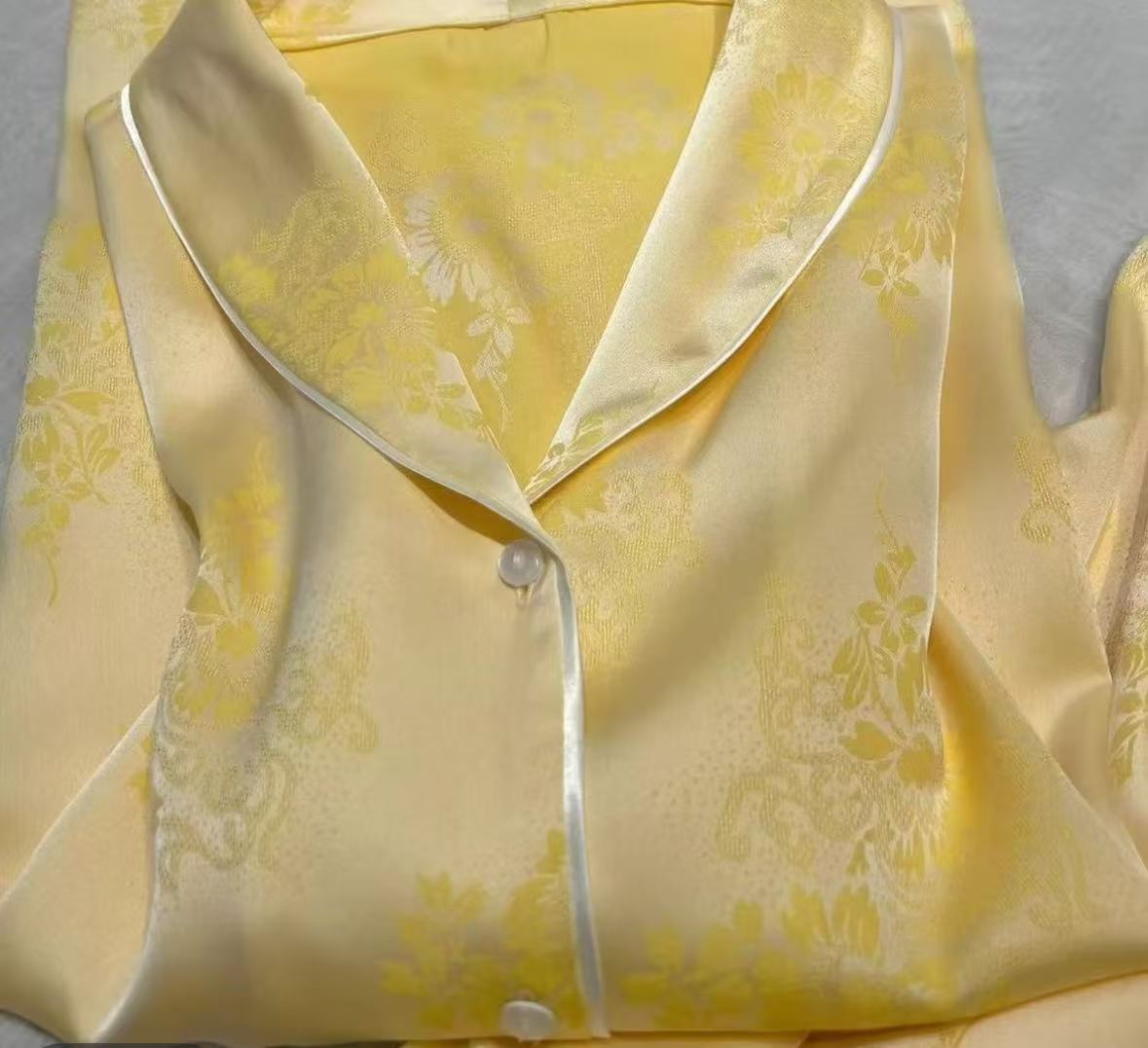 淡いイエローの生地にジャカード柄を重ね、袖口のレースで華やかさを加えたシルクルームウェアです。写真映えと装飾性を両立したシリーズとして提案できます。