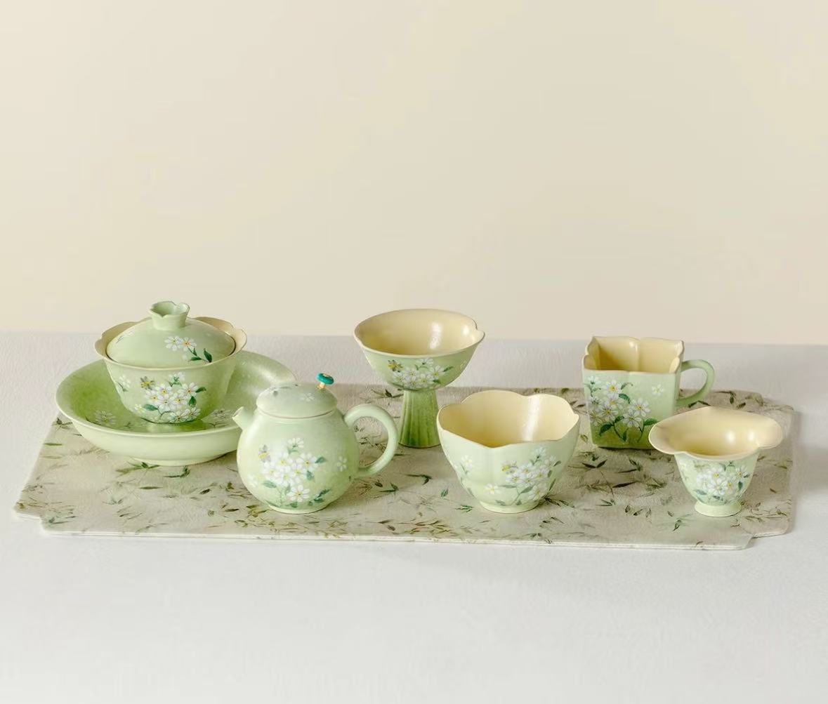 紫系の蓋付き碗、竹絵の蓋碗、春色のセット展示など、ギフト性と見栄えを重視した茶器群です。単品よりもセット提案に強く、展示会や商談でも印象を作りやすい商品です。