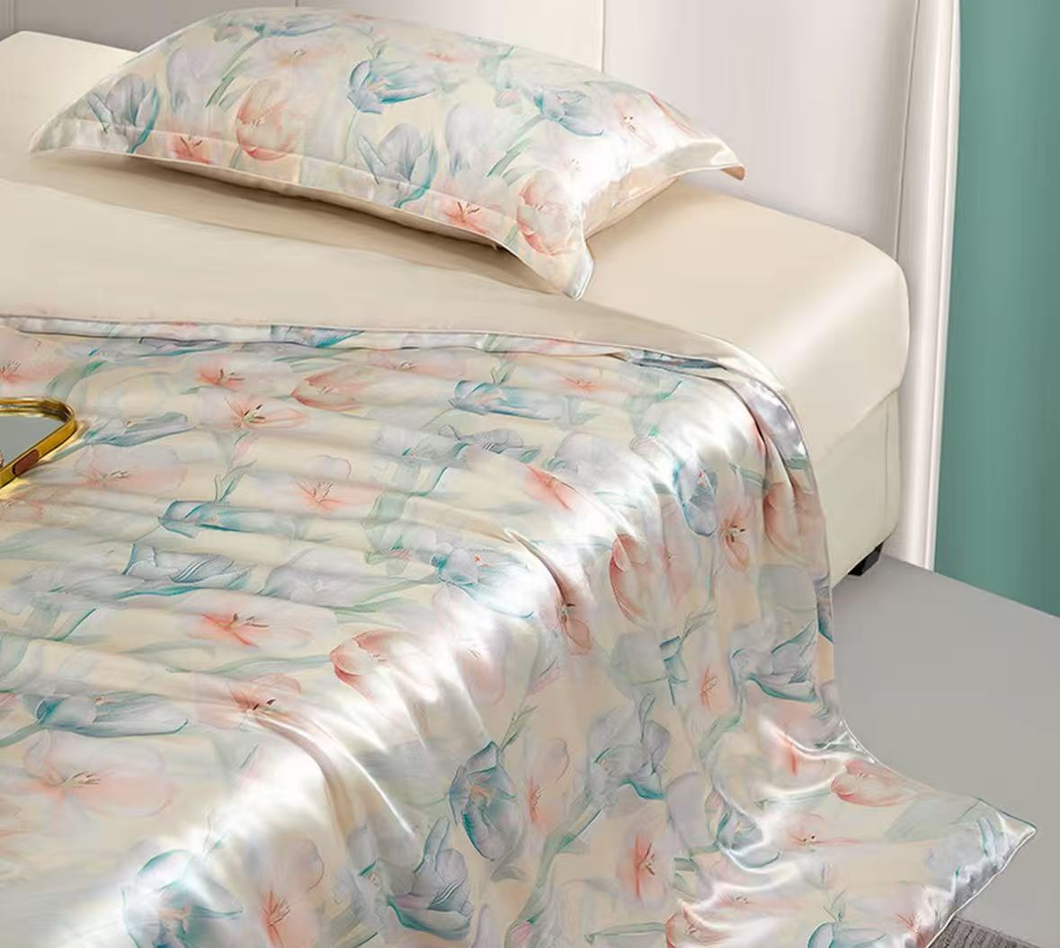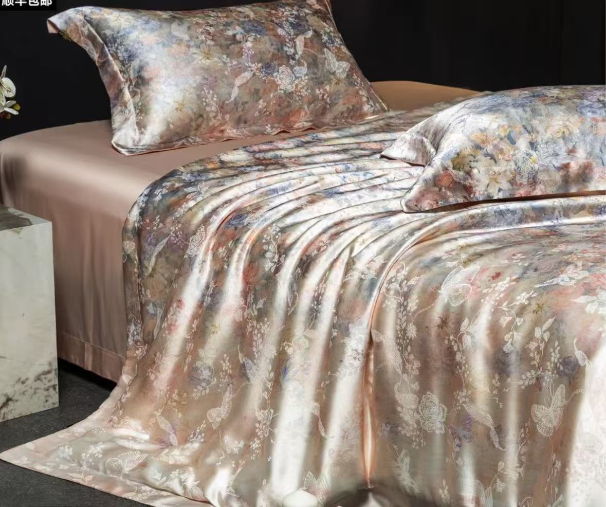 淡い花柄やぼかしのある表現で、華やかさを保ちながらも派手すぎない印象にまとめた寝装シリーズです。女性向けやギフト需要にもつなげやすく、写真映えの良さもあります。